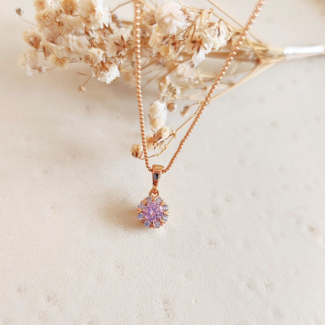 Collar con dije circular con aplicación de un circón rosado y circones blancos.