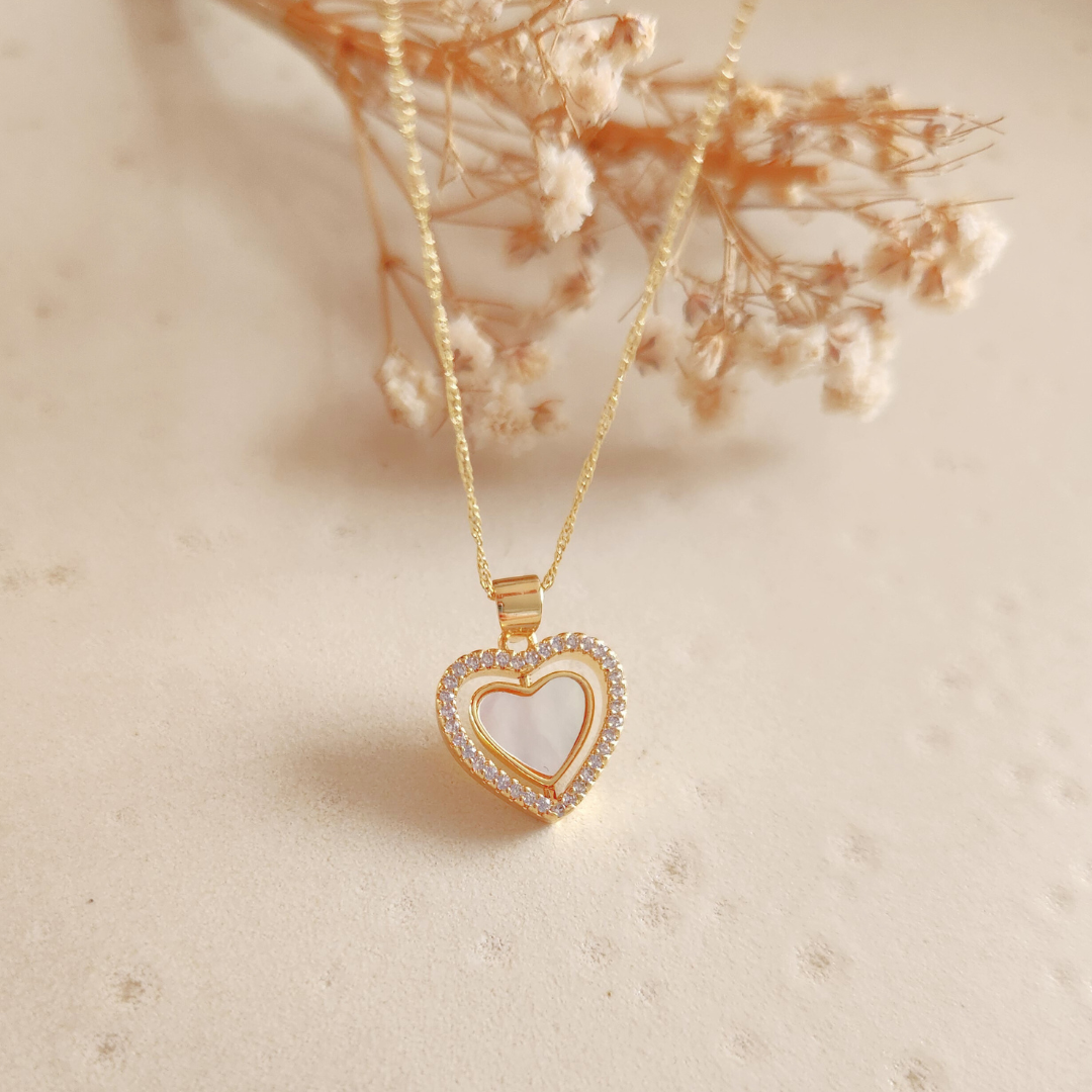 Collar con dije de corazón con aplicación de circones blancos y nacár.