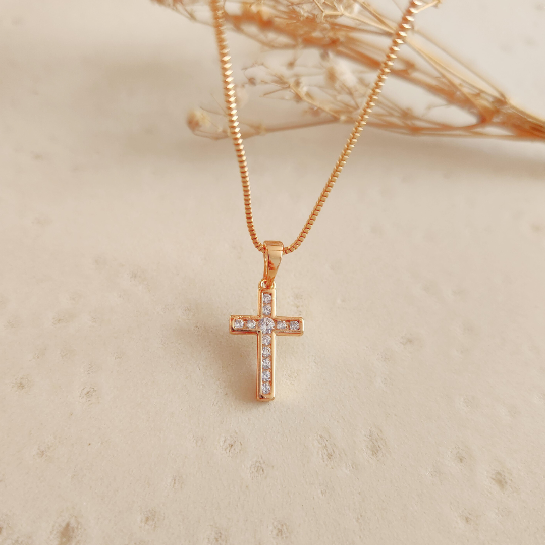 Collar Cruz con circones, un diseño elegante y devoto. Con detalles brillantes, es el accesorio perfecto para expresar fe y estilo.