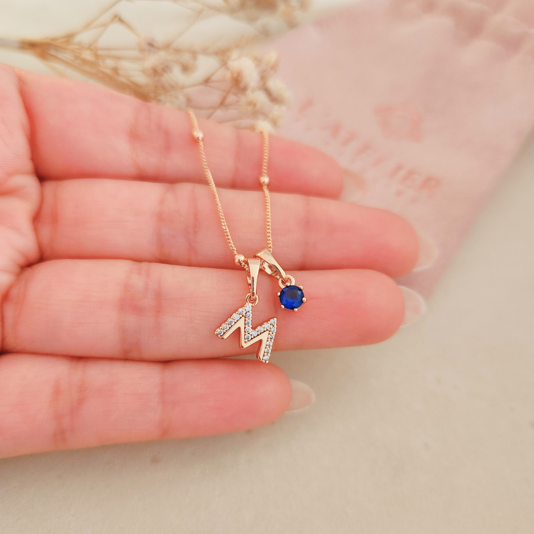 Collar con doble dije: 1 dije de la inicial de su elección y 1 dije de punto de luz de color azul oscuro.