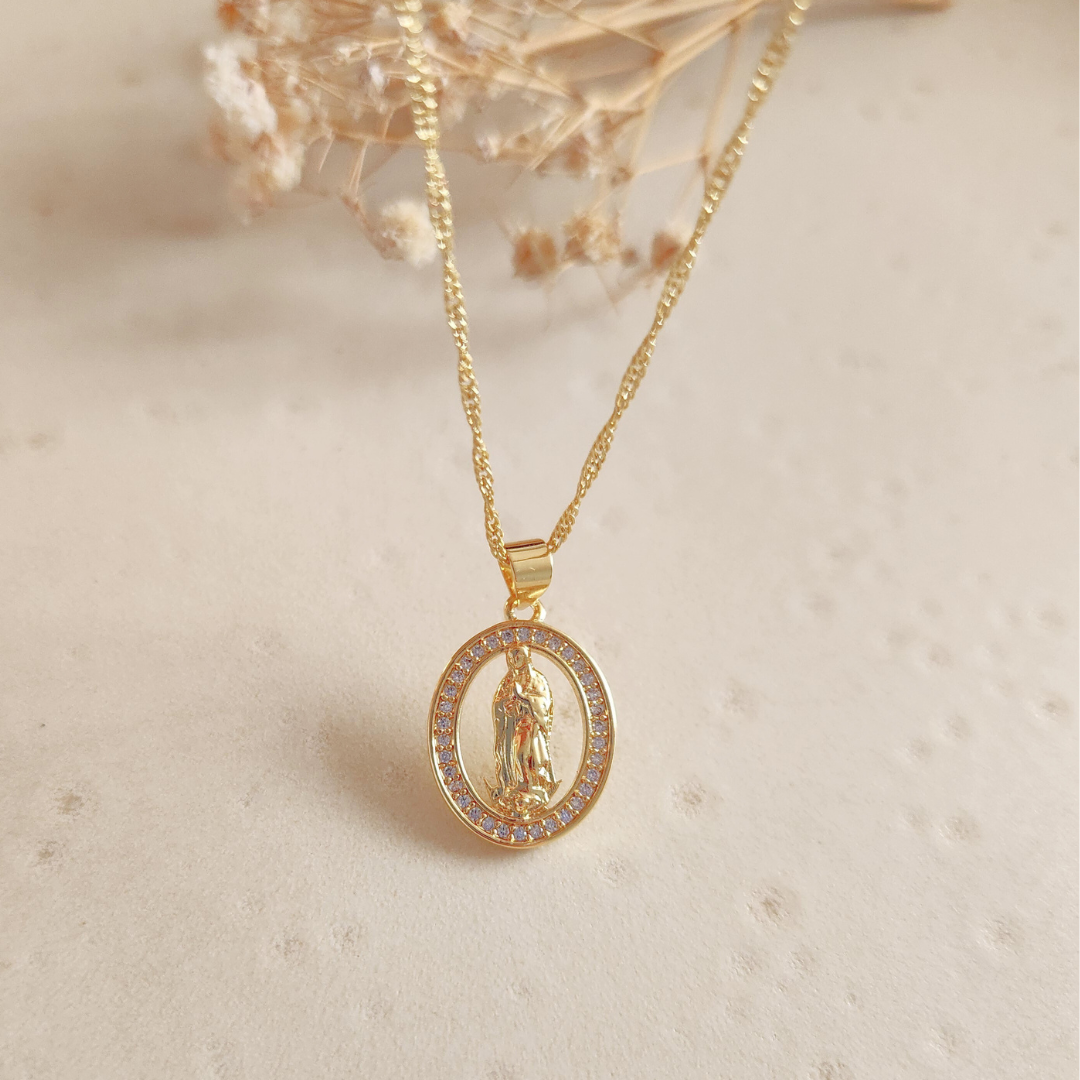 Collar con Dije de Virgen y circones blancos: una joya delicada y espiritual, con un toque brillante que simboliza protección y fe. Perfecto para regalar o lucir con elegancia.