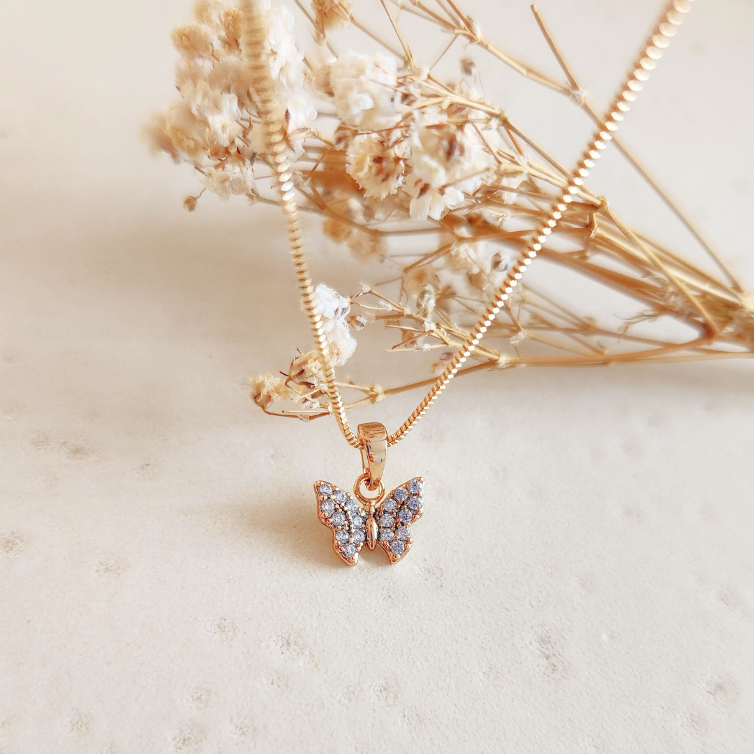 Collar Mariposa Strass Rose: una joya delicada y elegante con diseño de mariposa y strass en tono rosa, que aporta un toque de brillo y feminidad. Perfecto para añadir un toque romántico a tu look.