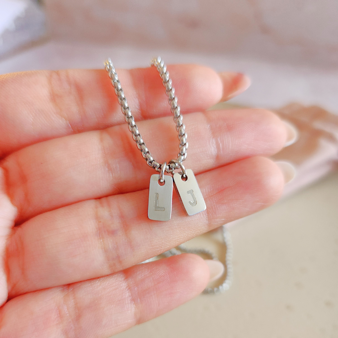 Collar de acero para hombre con 2 dijes de placas pequeñas que llevan grabadas las letras de tu preferencia.