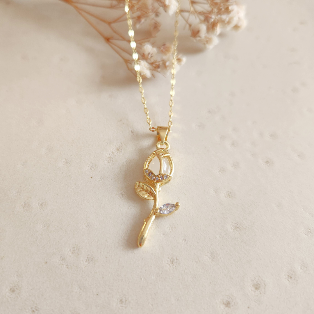 Collar con dije de Tulipán con aplicación de circones blancos.