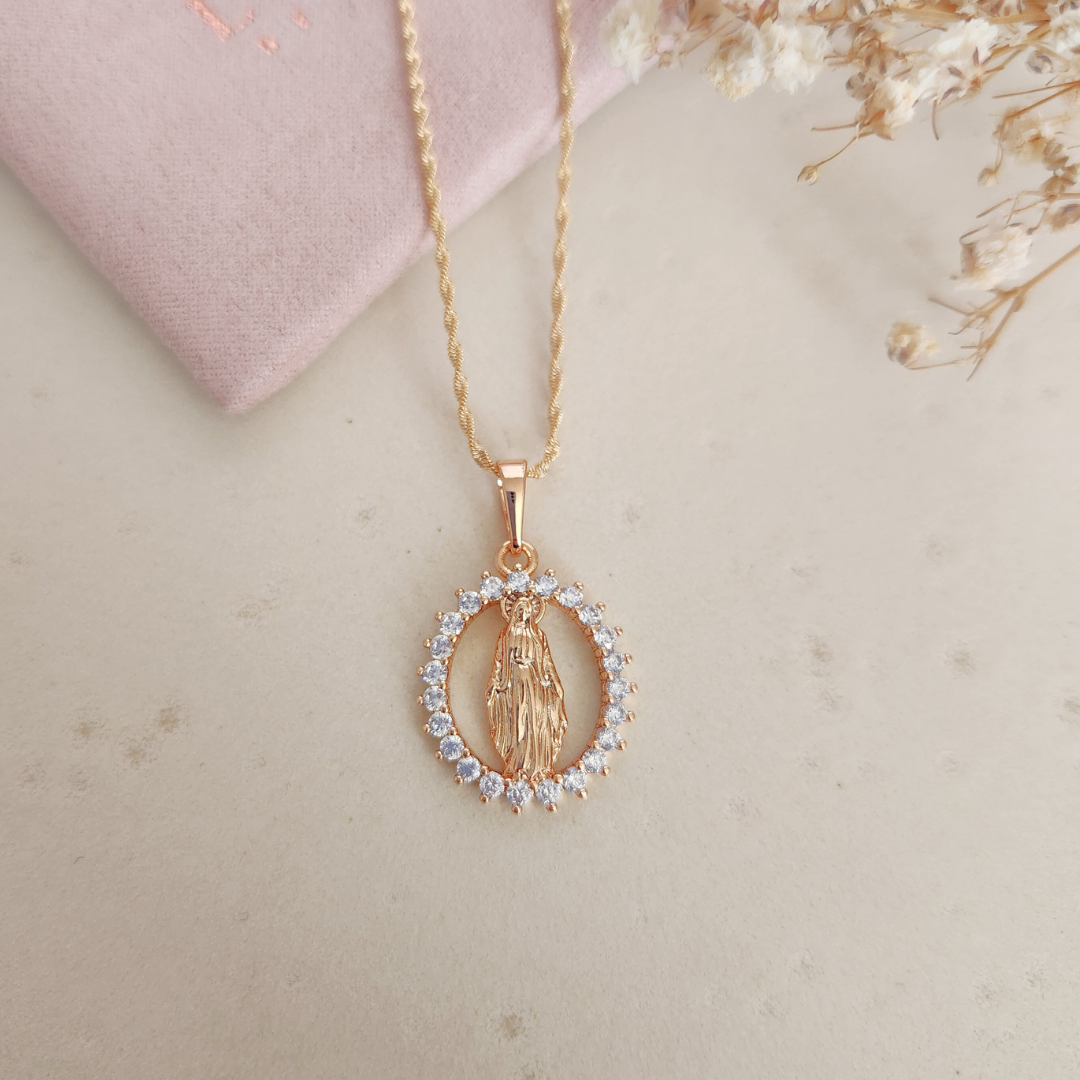 Collar Virgen Oval con circones brillantes, elegante y lleno de devoción. Perfecto para ocasiones especiales o como un toque único de fe y estilo.